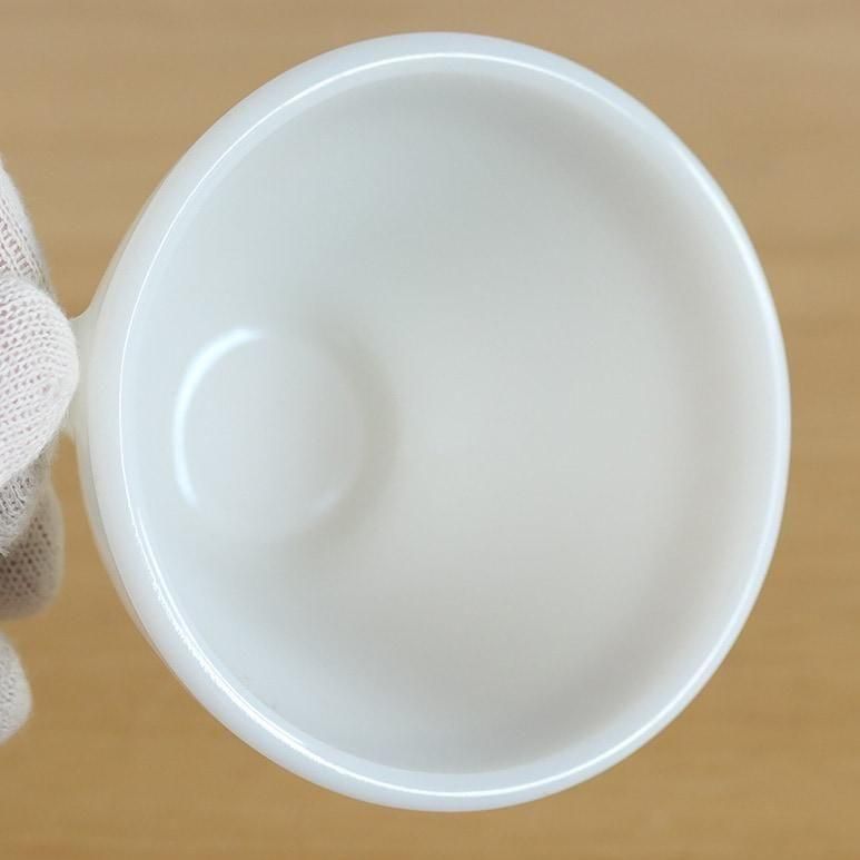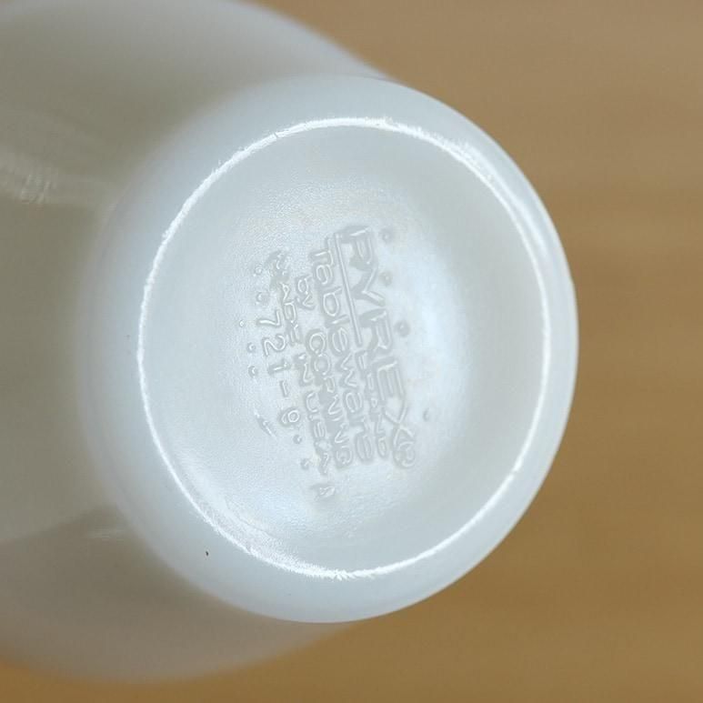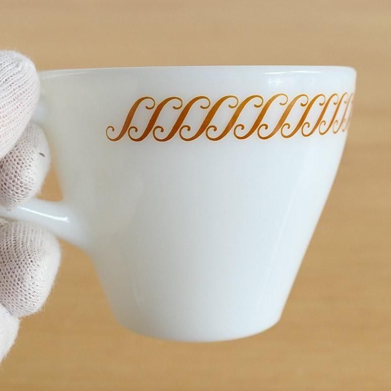 オールドパイレックスの「リージェンシー」シリーズ、ストレートタイプのカップです。ミルクガラスに落ち着いたカッパーブラウンのチェーン模様が施されたデザインで、シンプルながらも温かみのある雰囲気が魅力です。日常使いはもちろん、コレクションとしても人気のアイテムです。