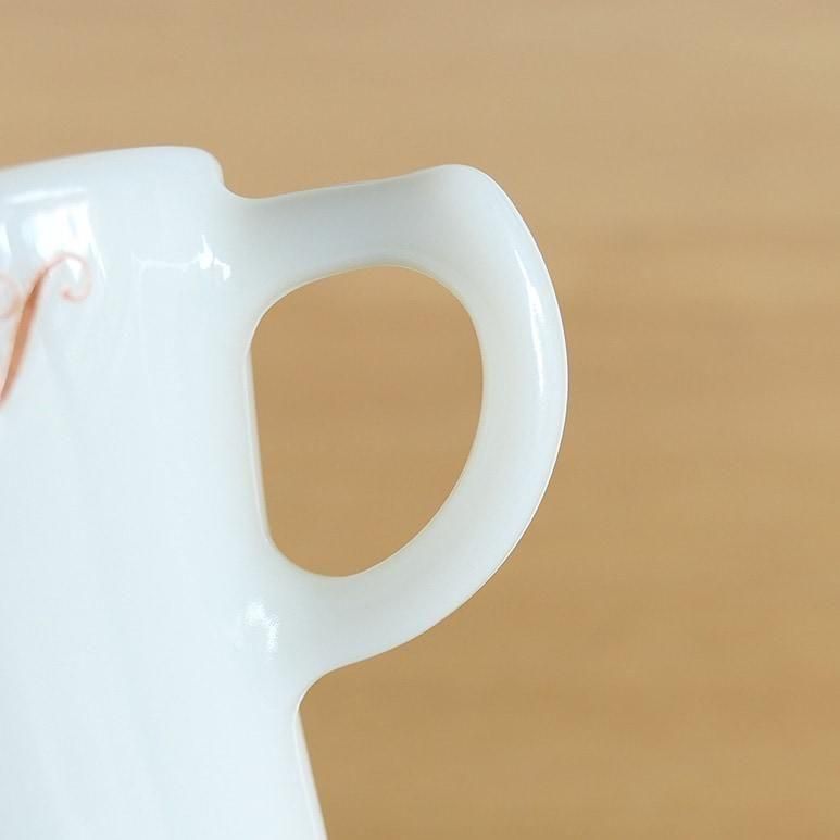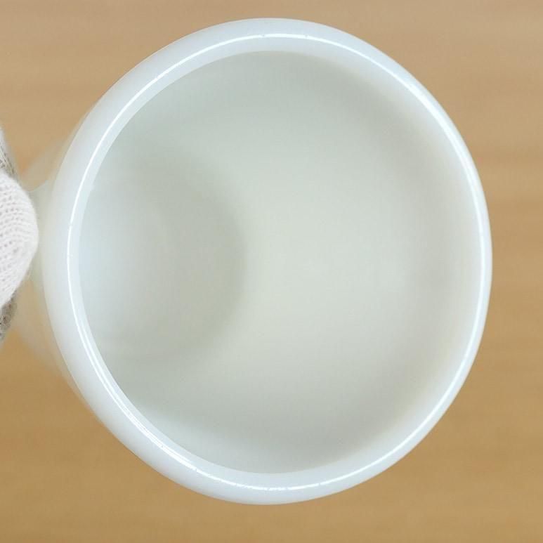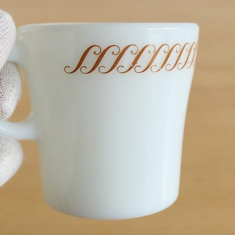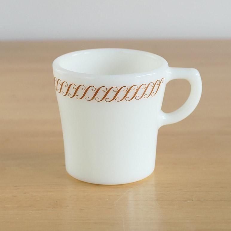 オールドパイレックスの「リージェンシー」シリーズ、チャイルドマグです。ミルクガラスにカッパーブラウンのチェーン模様が入った可愛らしいサイズのマグで、小ぶりながら存在感があります。子供用としてはもちろん、コレクションやディスプレイにもおすすめのアイテムです。