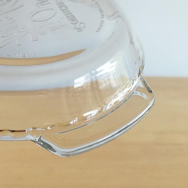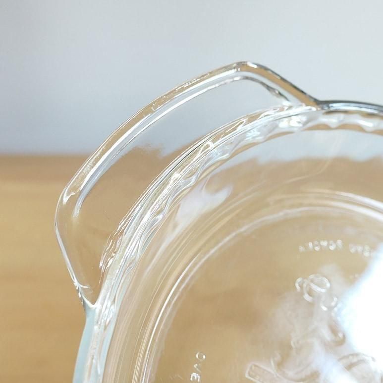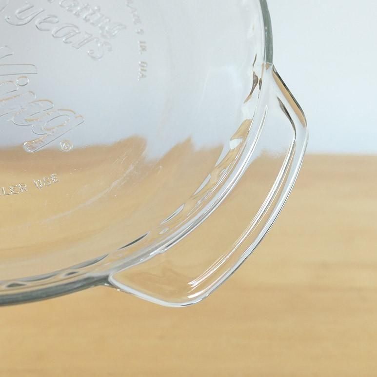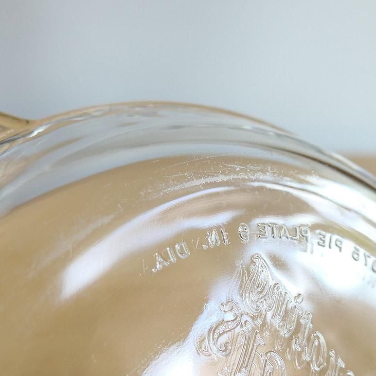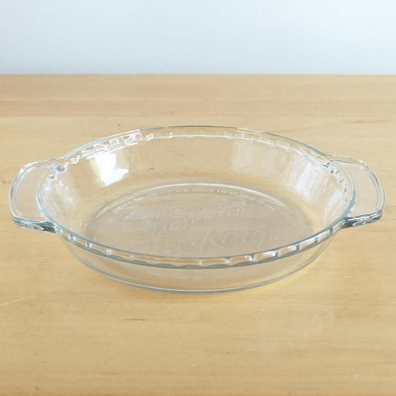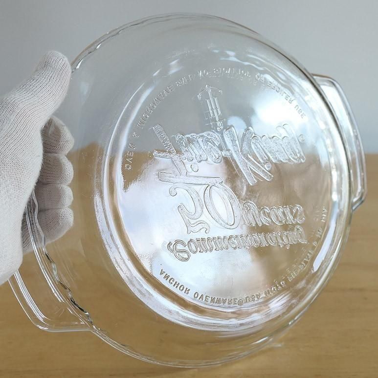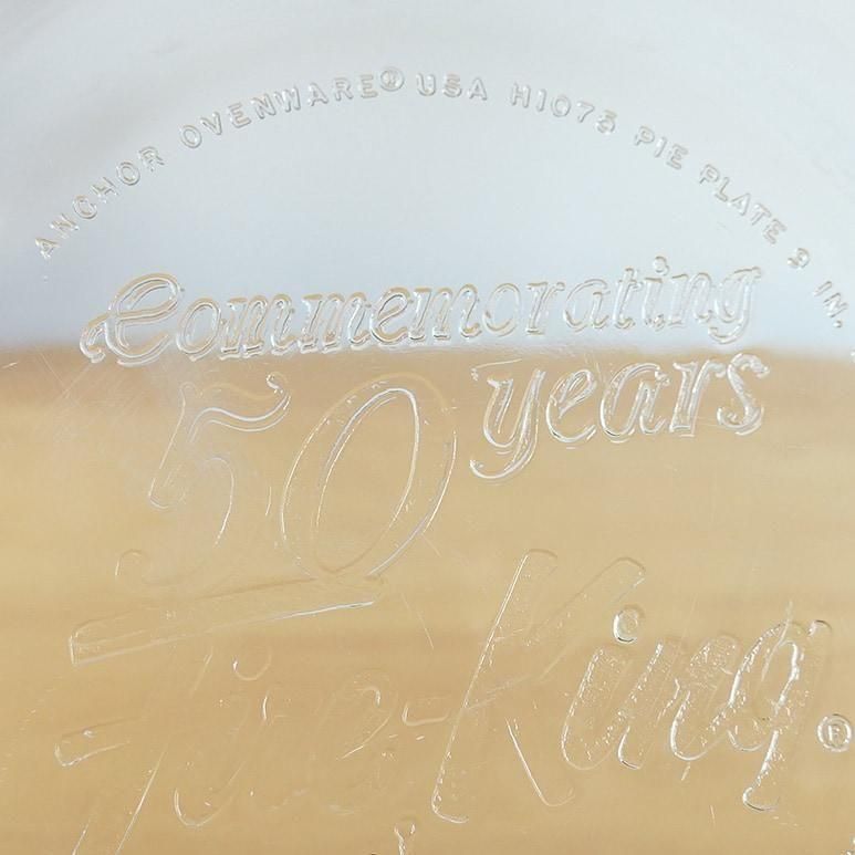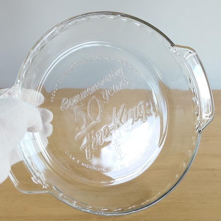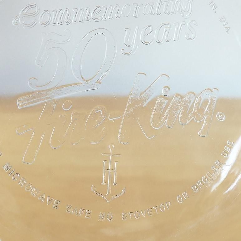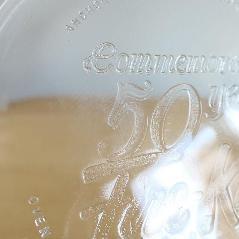 ファイヤーキング クリスタル ディープパイプレート 50周年記念モデルです。1990年代にアンカーホッキング社が Fire-King 誕生50周年を記念して製造した限定品で、底面に「Commemorating 50 years Fire-King」と刻印があります。通常のパイプレートよりも深さがあり、記念アイテムとしても人気の高い一枚です。