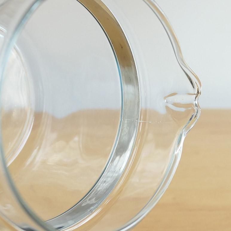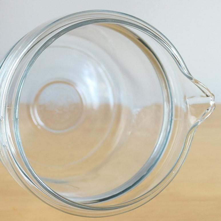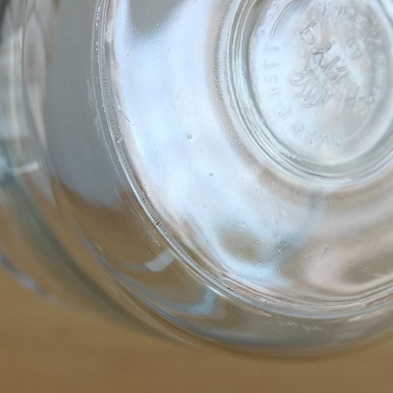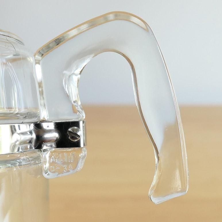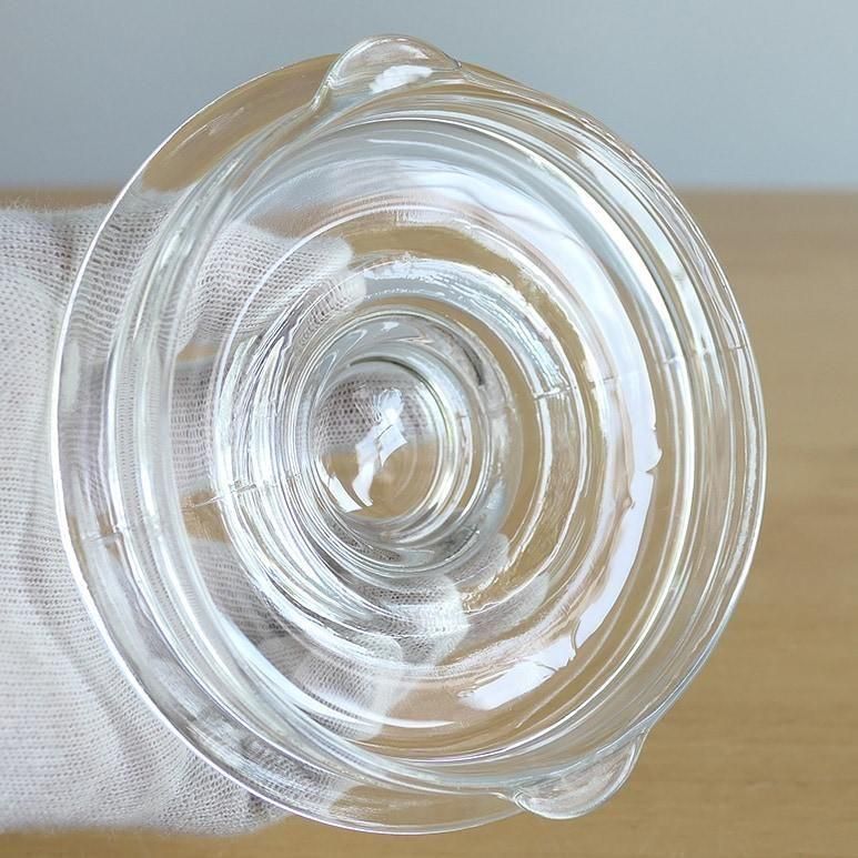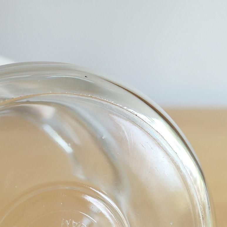 オールドパイレックスのパーコレーターは、4カップ、6カップ、9カップの3種類あり、こちらは真ん中のサイズになります。お茶入れとして使う時の参考までに、中の部品を外した状態で水を入れると、8分目ぐらいで1.7リットル、フタぎりぎりの満タンで2.0リットル入ります。