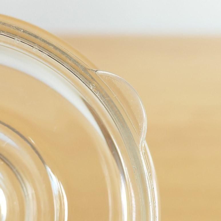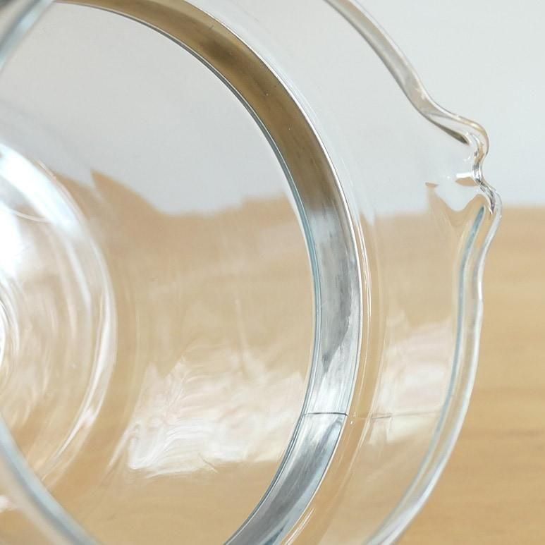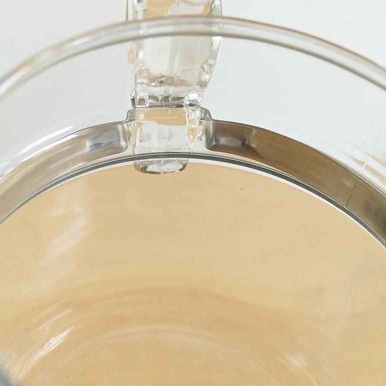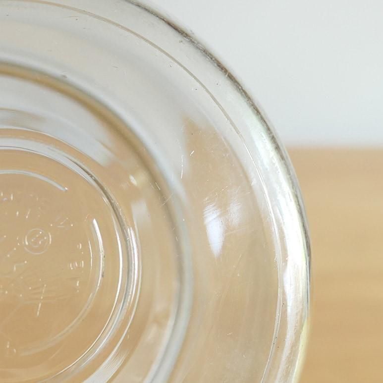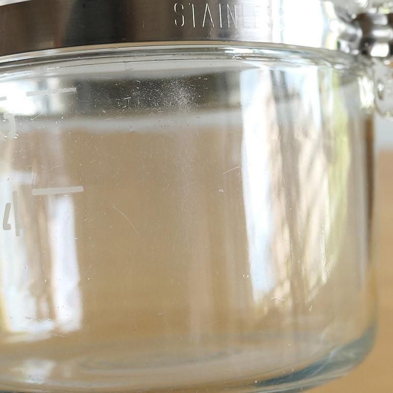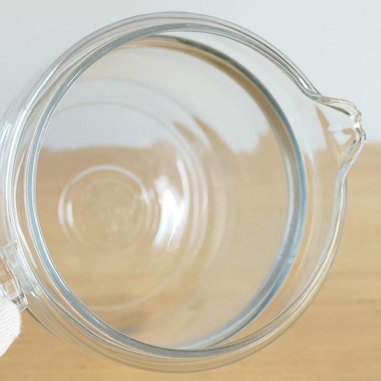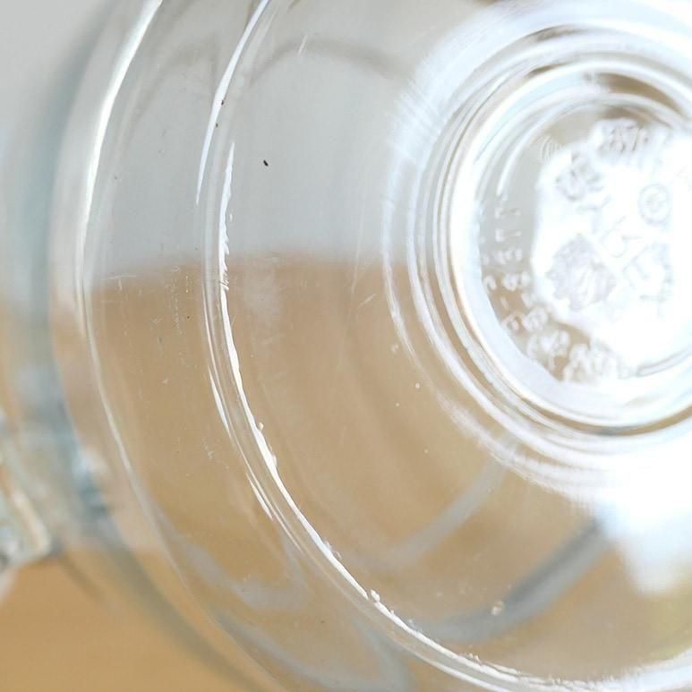 オールドパイレックスのパーコレーターは、4カップ、6カップ、9カップの3種類あり、こちらは真ん中のサイズになります。お茶入れとして使う時の参考までに、中の部品を外した状態で水を入れると、8分目ぐらいで1.7リットル、フタぎりぎりの満タンで2.0リットル入ります。