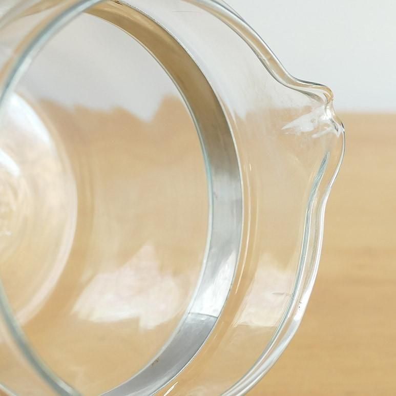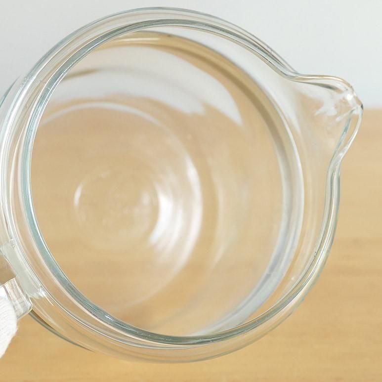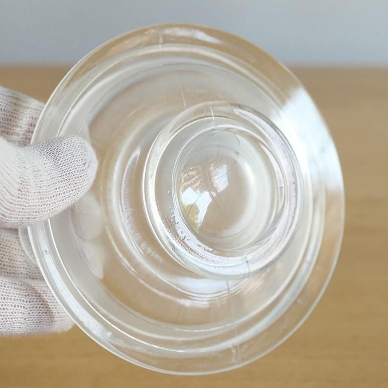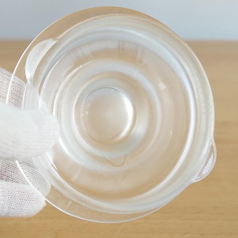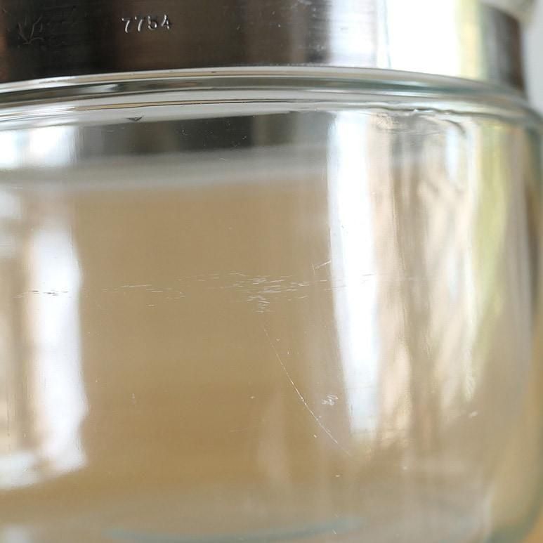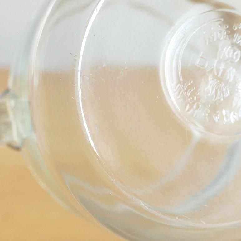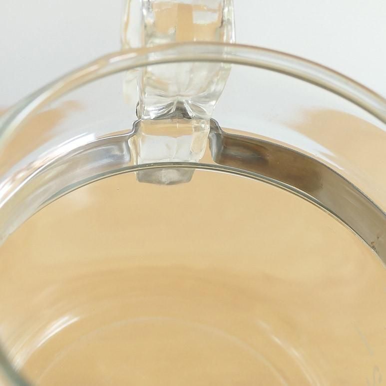 オールドパイレックスのパーコレーターは、4カップ、6カップ、9カップの3種類あり、こちらは一番小さいサイズです。お茶入れとして使う時の参考までに、中の部品を外した状態で水を入れると、8分目ぐらいで1.2リットル、フタぎりぎりの満タンで1.3リットル入ります。