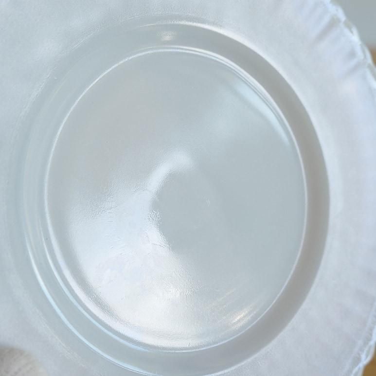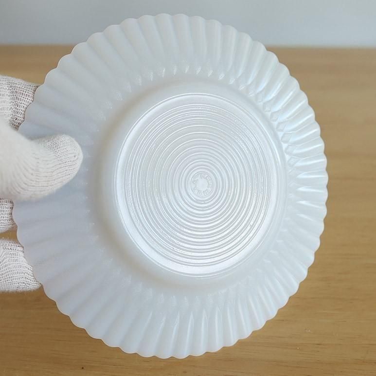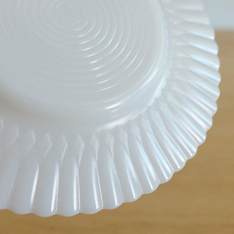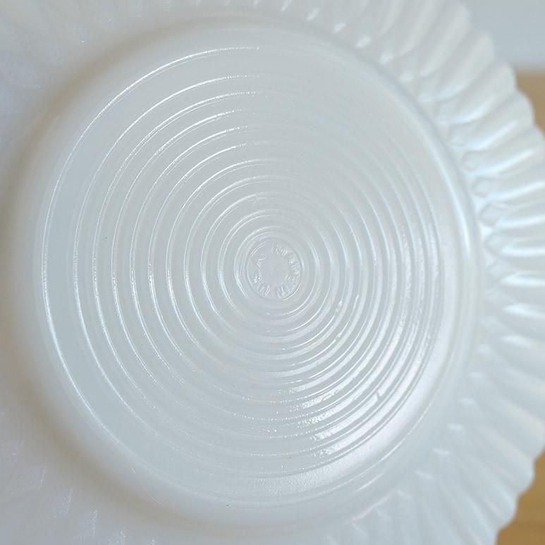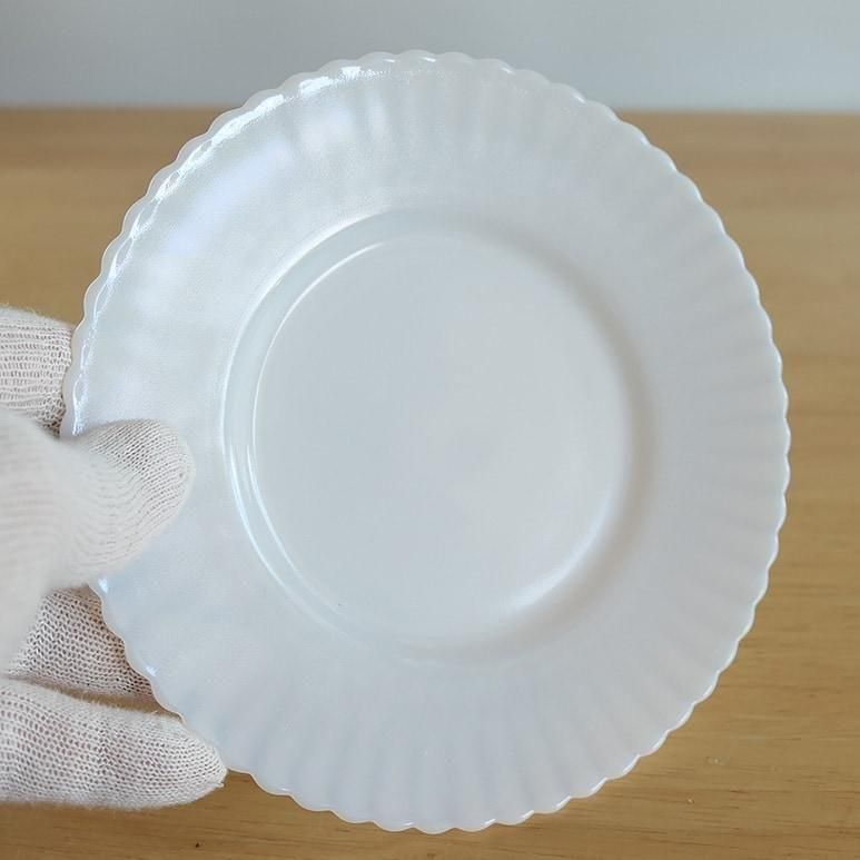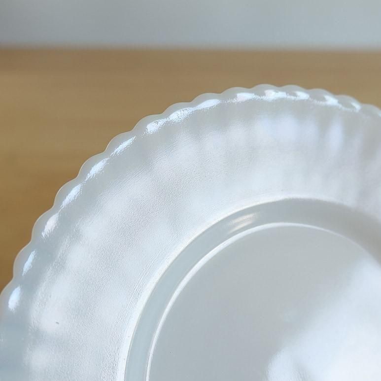 花びらのような繊細なデザインが美しいマクベスエバンス社のケーキプレート。向こうが透けて見えるような透明感が特徴のミルクガラスです。カラーはモナックス(ホワイト)です。