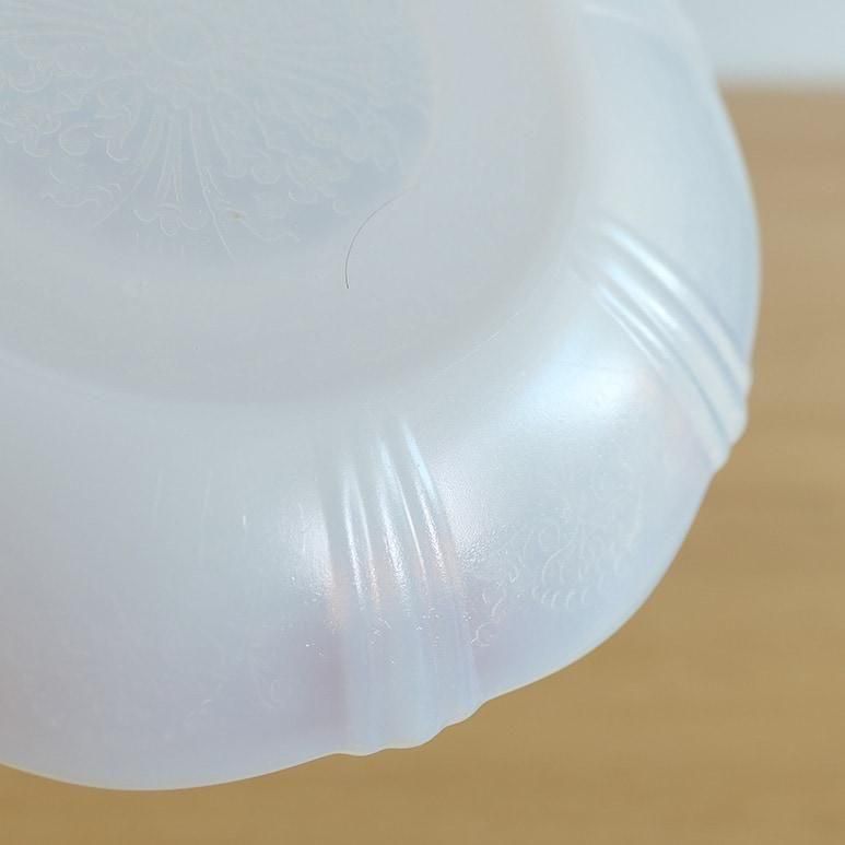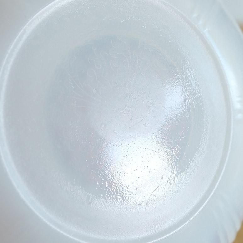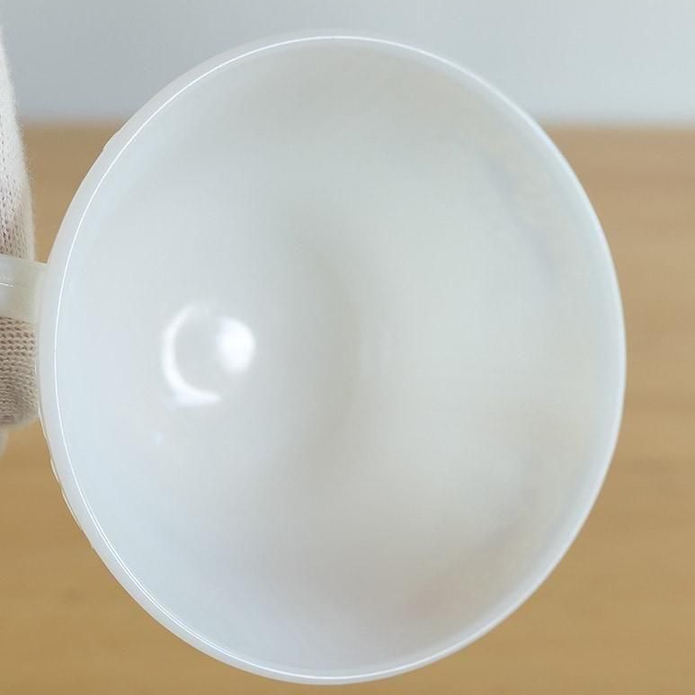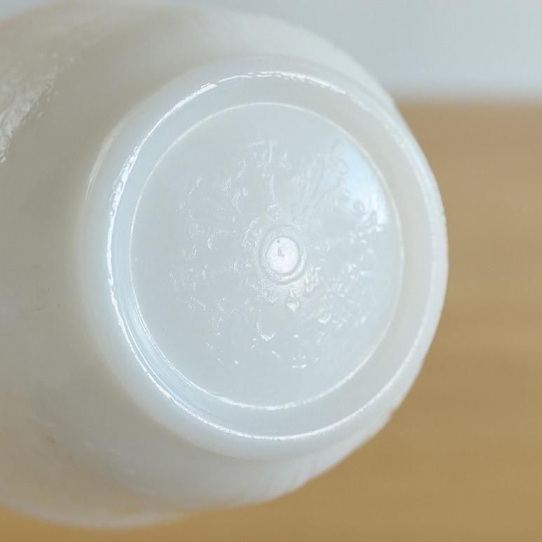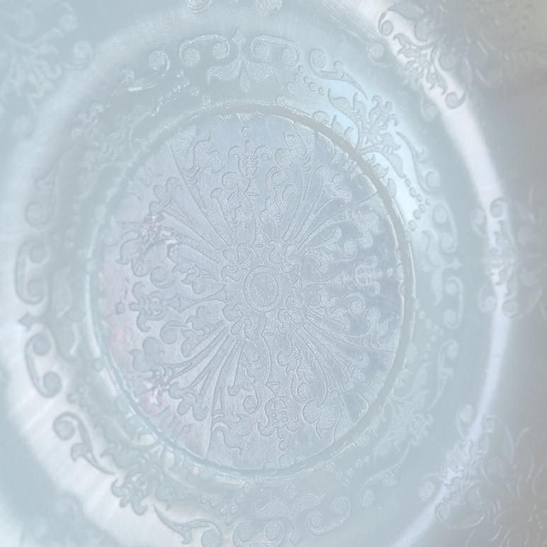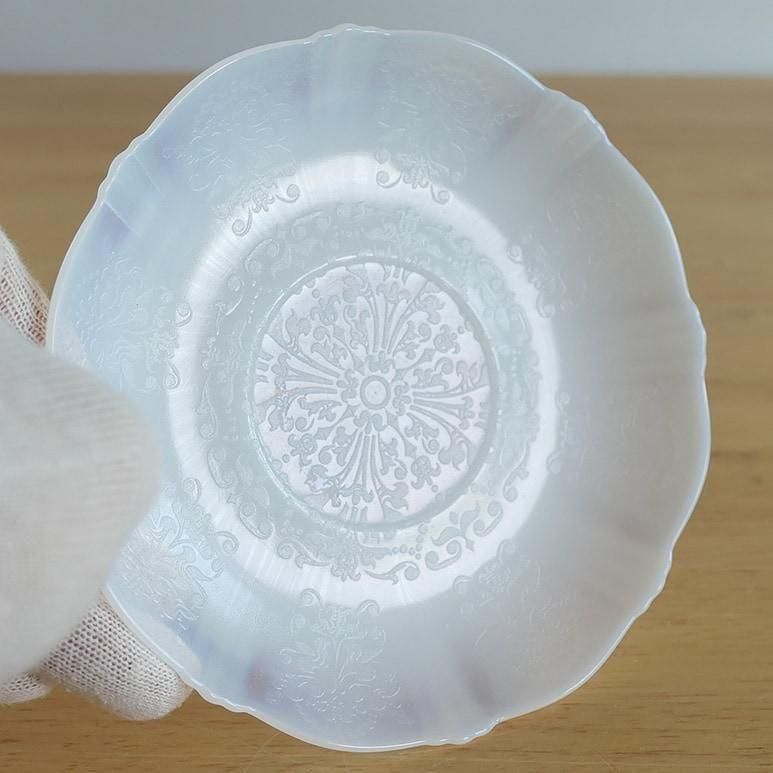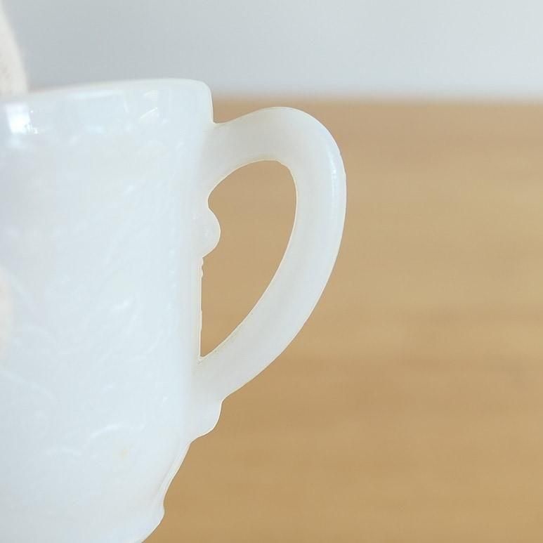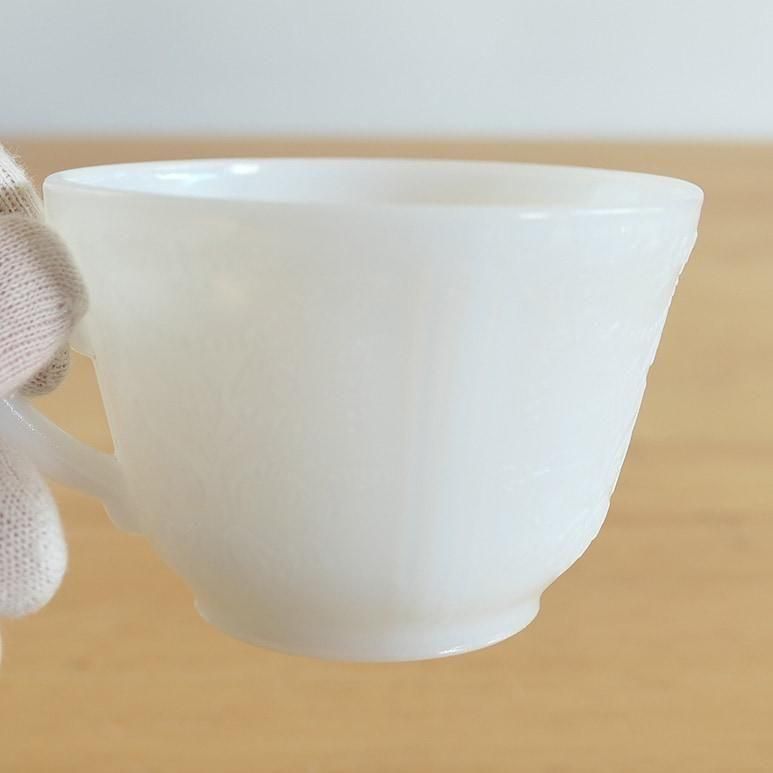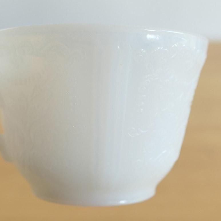 マクベスエバンス社のカップ&ソーサー。繊細なエンボスが美しいです。向こうが透けて見えるような透明感のあるミルクガラスで、カラーはモナックス(ホワイト)です。