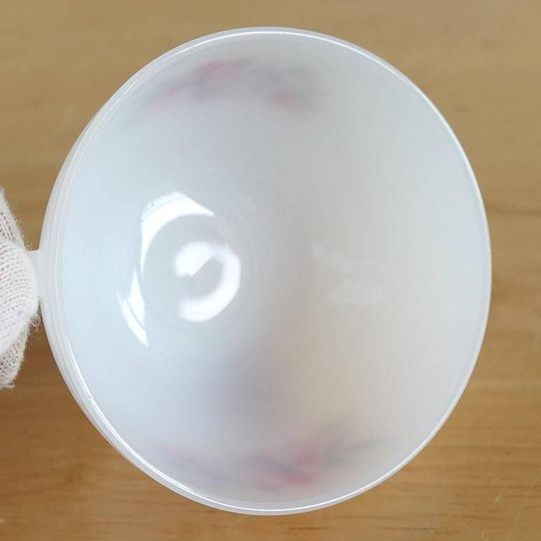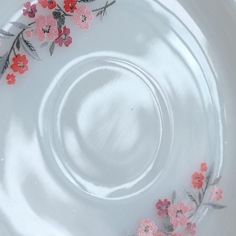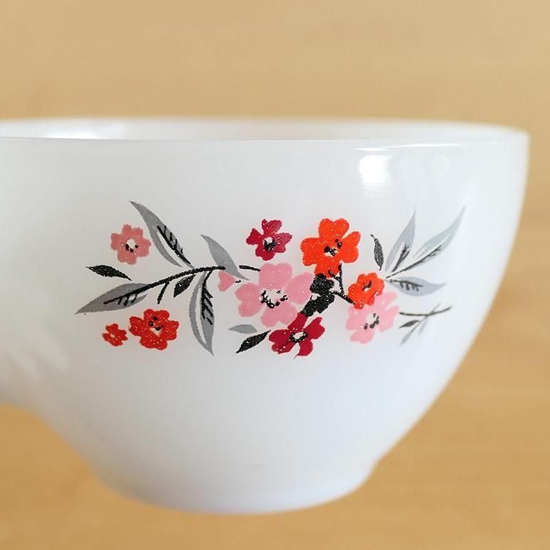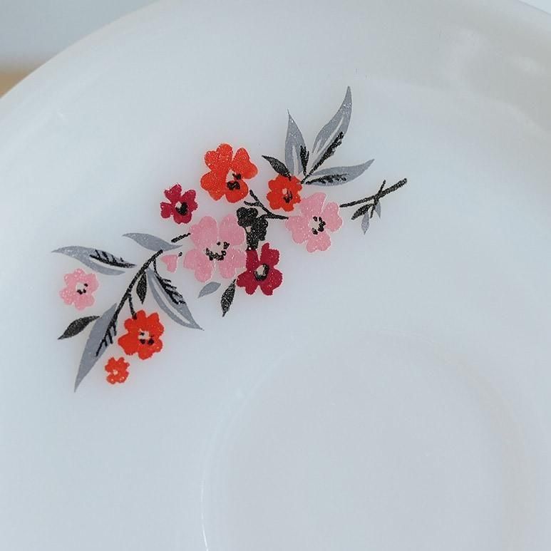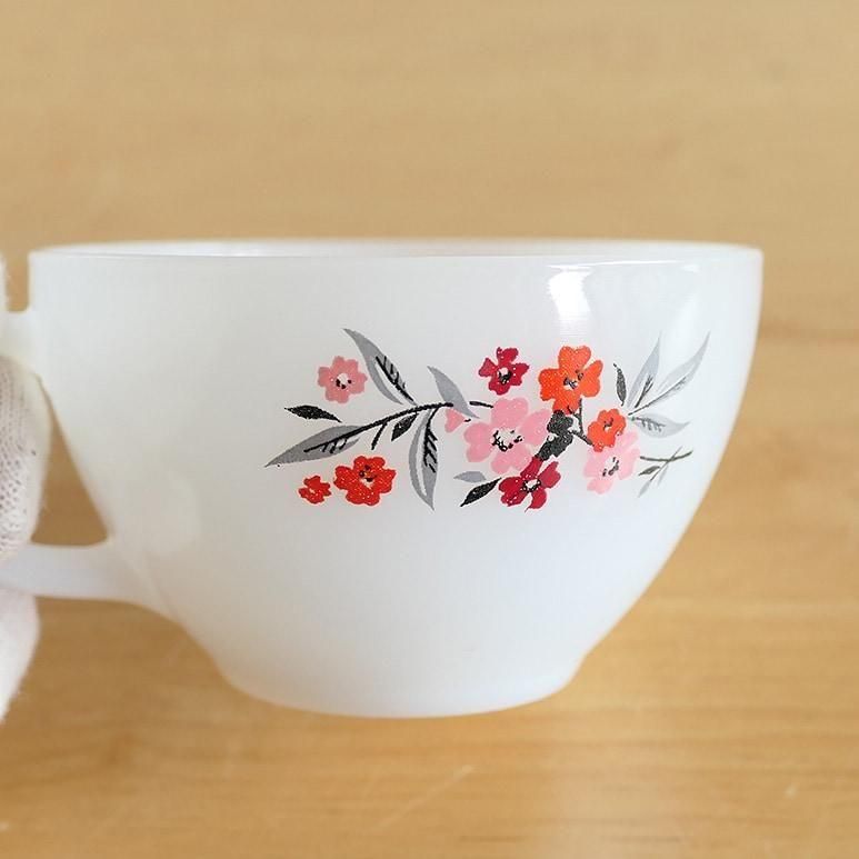 ファイヤーキング「プリムローズ」カップ&ソーサー。赤とピンクの花模様が可憐な人気シリーズで、柔らかなミルクガラスとの組み合わせが上品な印象です。ティータイムを華やかにしてくれる一客です。