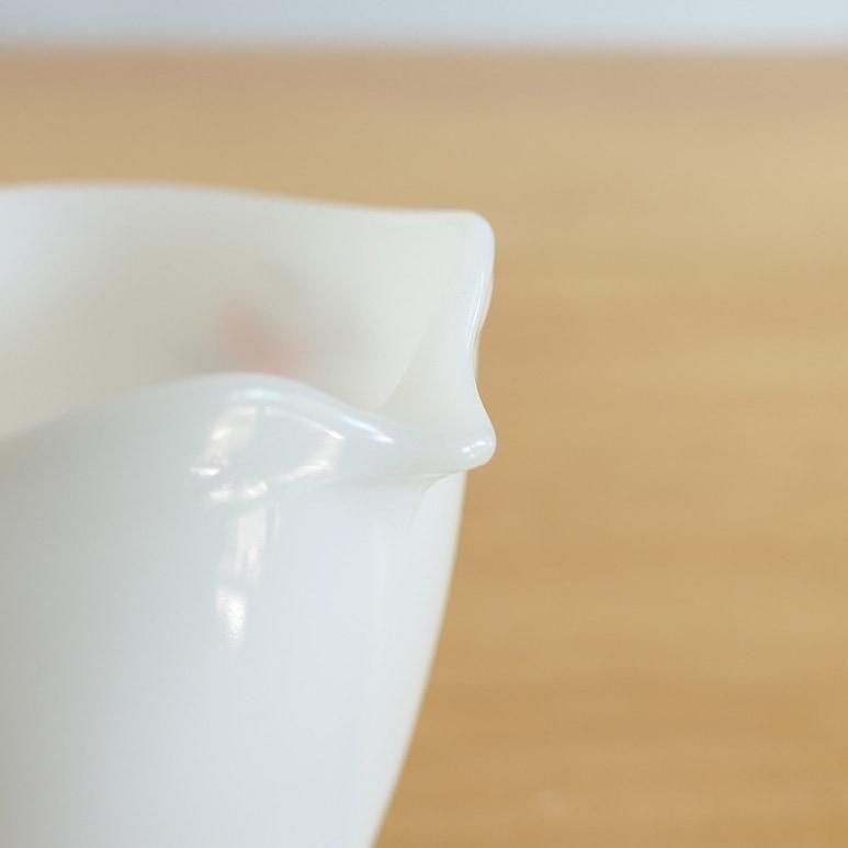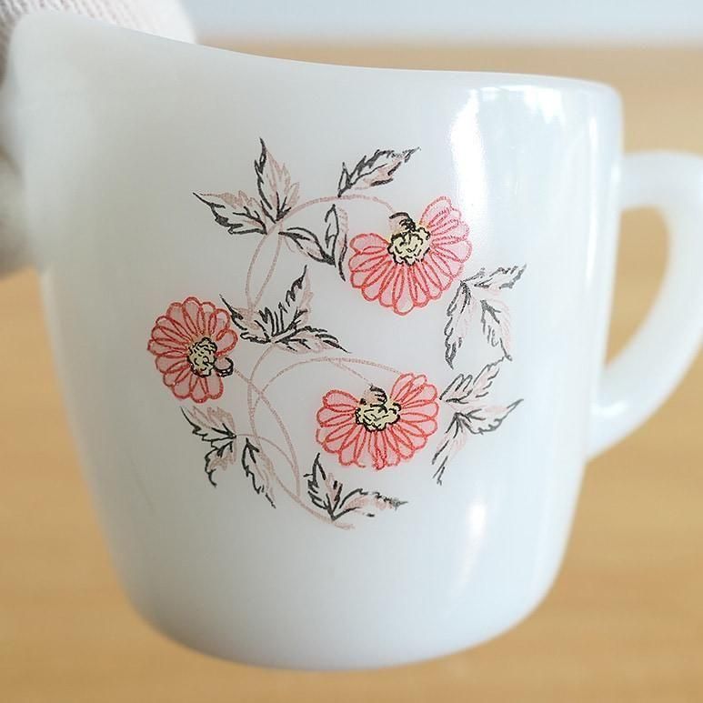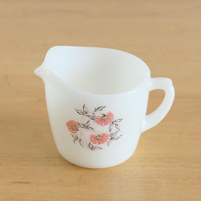 ファイヤーキング「フルーレット」クリーマー。やわらかなピンクの花柄が可憐で、優しい印象の一品です。ミルクやシロップを入れるのはもちろん、小さな花を飾るフラワーベースとして使っても素敵。シリーズで揃えるとより華やかなテーブルコーディネートが楽しめます。