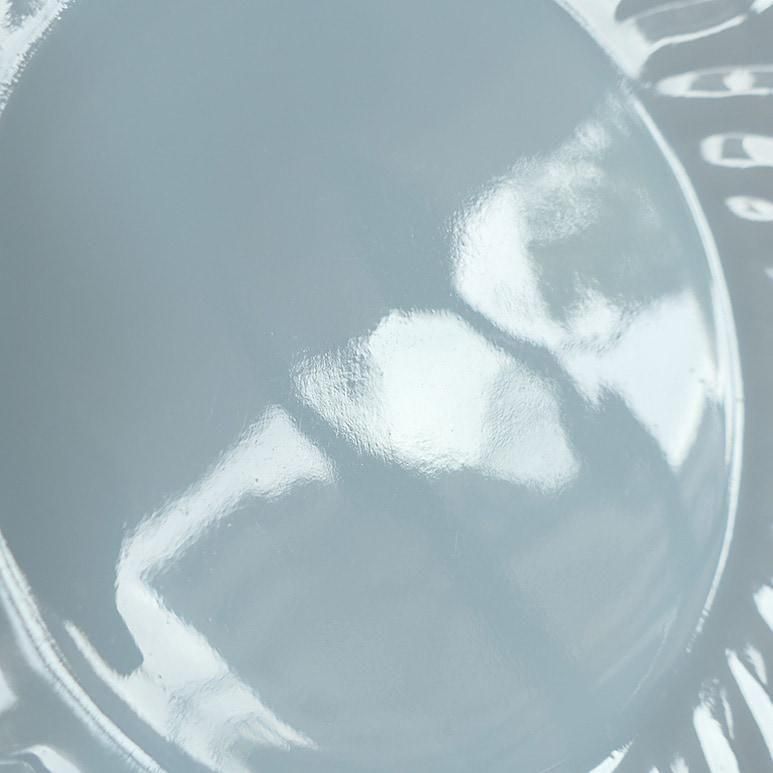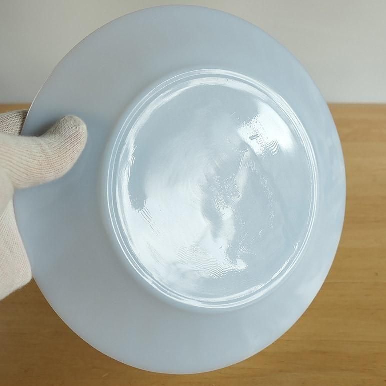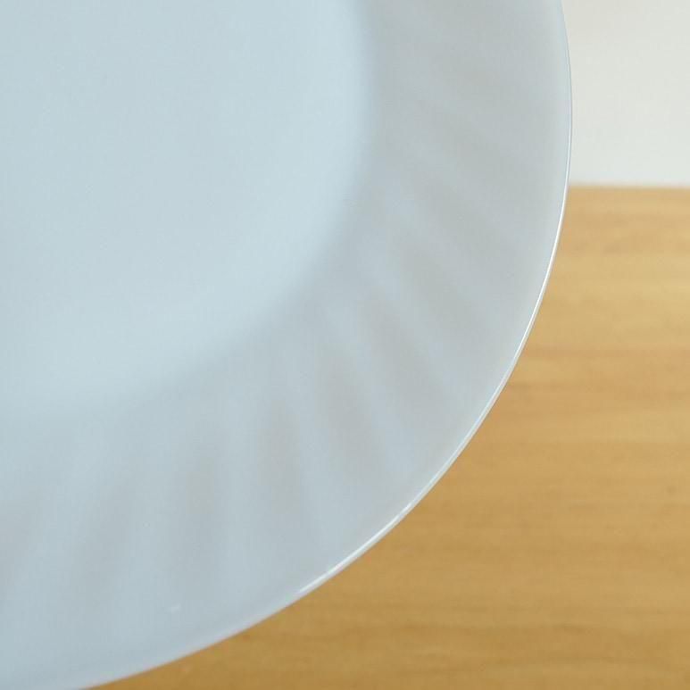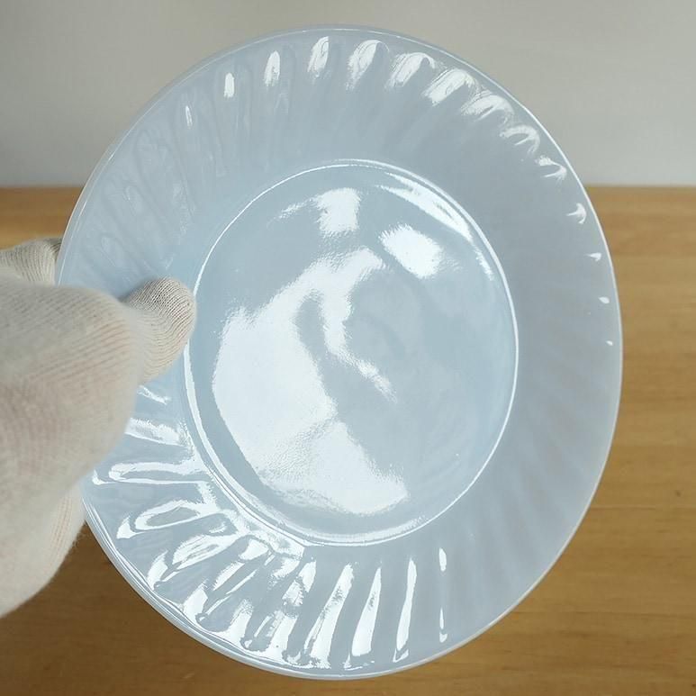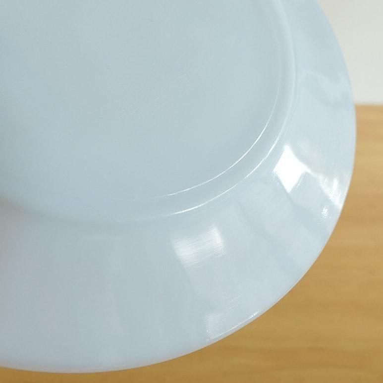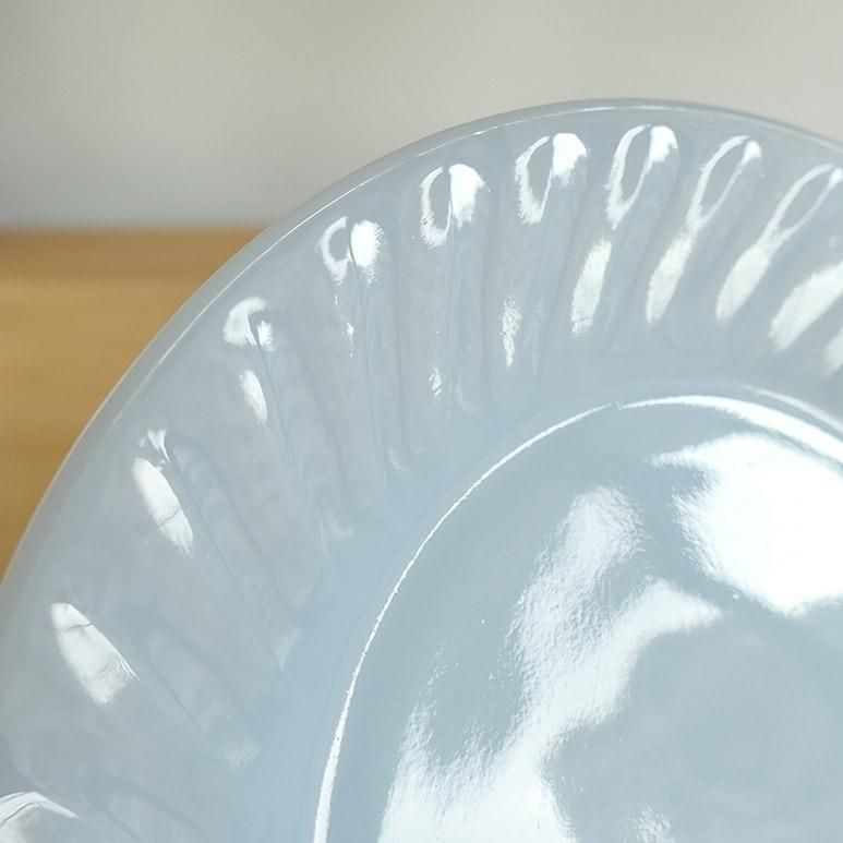 ファイヤーキング「アズライト スワール」ディナープレート。やわらかなブルーを帯びたミルクガラスに、放射状のスワール模様が美しく浮かび上がるシリーズです。光を受けるとふんわり透けるアズライトカラーが上品で、テーブルを明るく彩ります。メインディッシュやデザートプレートとしても活躍する、使いやすい一枚です。