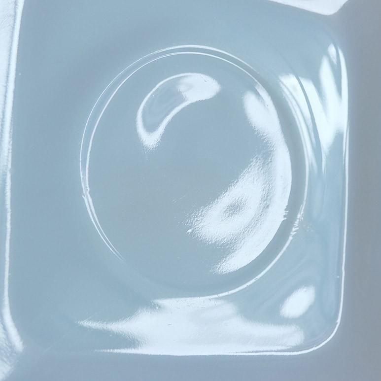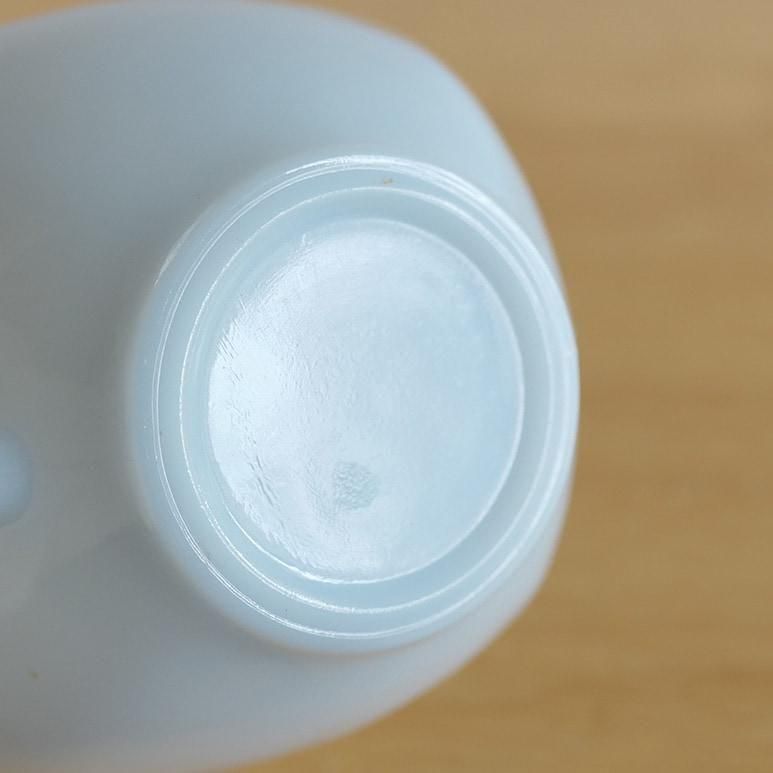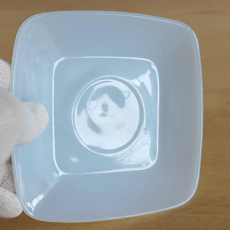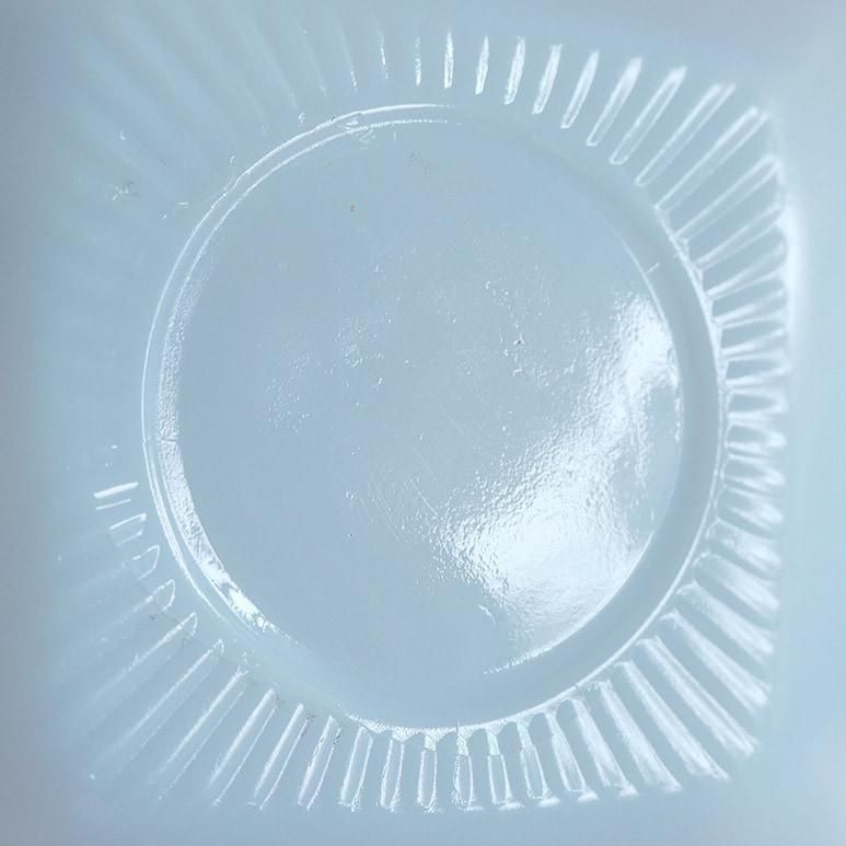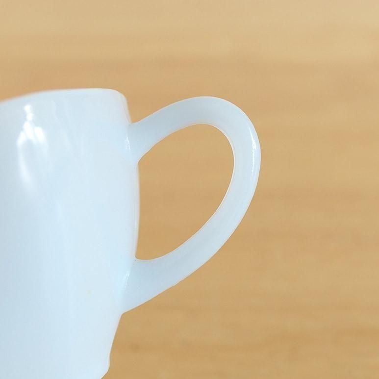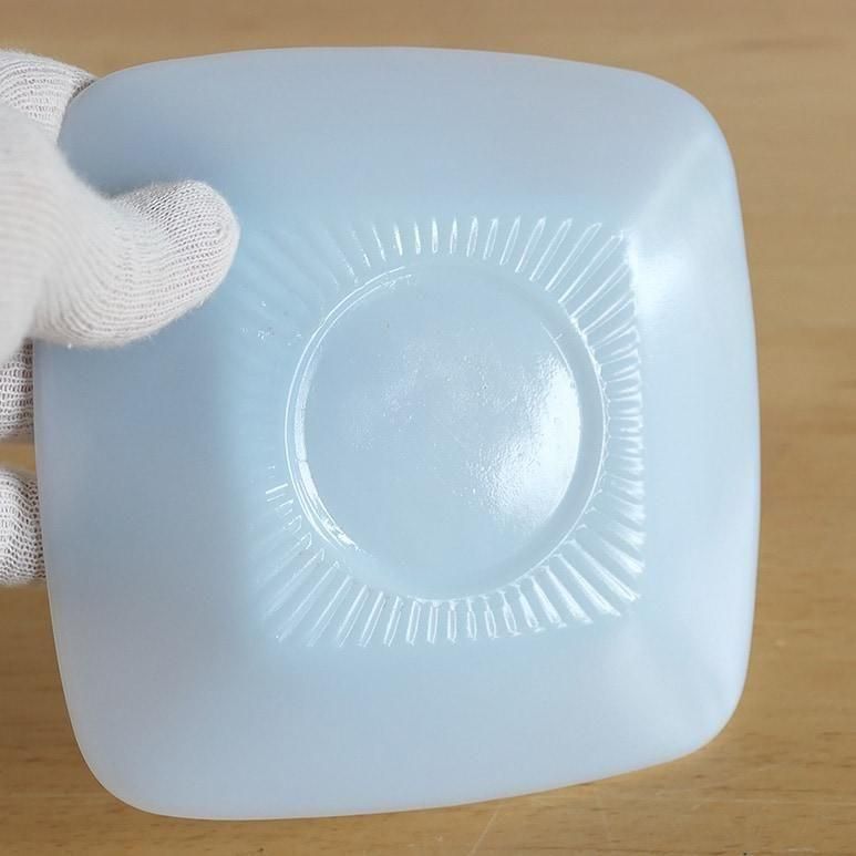 ファイヤーキング「アズライト チャーム」カップ&ソーサー。やわらかなブルーがかったミルクガラスの色合いが美しい、人気のアズライトシリーズです。角の丸いスクエア型フォルムがモダンで、1950年代らしい洗練されたデザイン。上品で軽やかな印象のC&Sは、紅茶やコーヒータイムを優雅に演出してくれます。