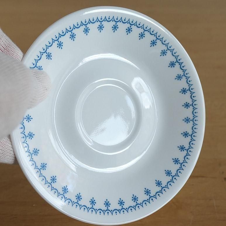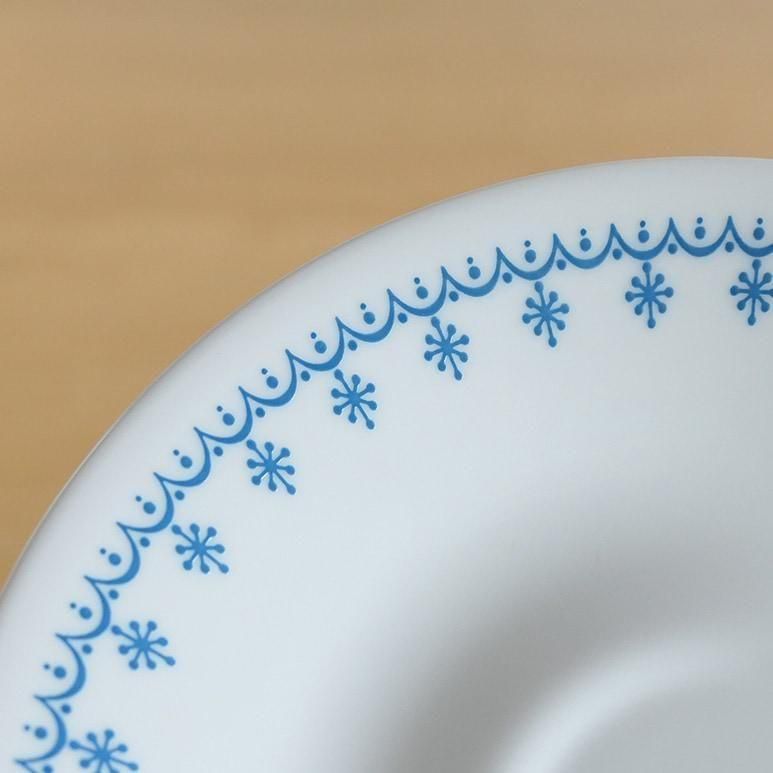 淡いブルーのスノーフレーク模様がぐるりと入った、清潔感あふれるコレールのカップ&ソーサー。薄くて軽いのに丈夫で割れにくい、コレールならではの使い心地が魅力です。飽きのこない北欧風のデザインは、普段のティータイムをやさしく彩ってくれます。普段使いにも来客用にもぴったりの一品です。