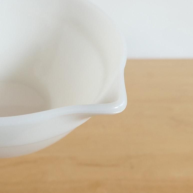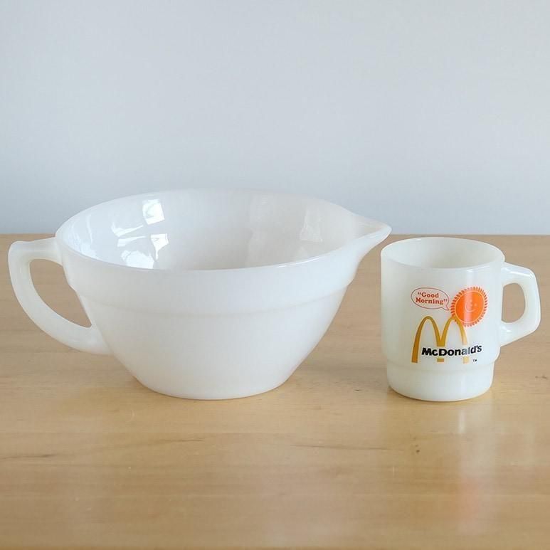 やわらかなミルクホワイトが美しい、ファイヤーキングのホワイト バターボウル。すっきりとしたフォルムと程よい厚みがあり、シンプルながら存在感のある一品です。サラダやフルーツ、スープ、下ごしらえ用のボウルとしても使いやすく、日常使いに幅広く活躍します。