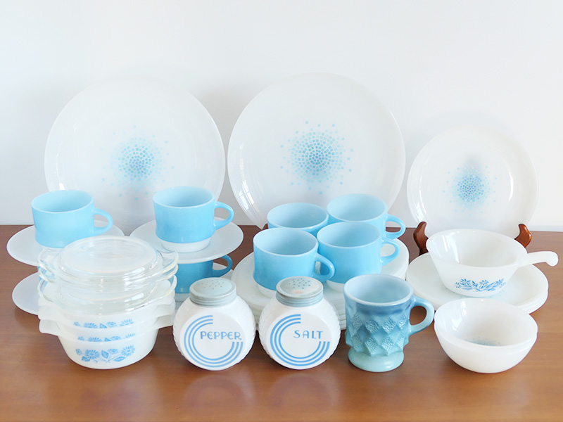 ブルーモザイクを中心に、ファイヤーキングらしい爽やかな青の食器を揃えました。